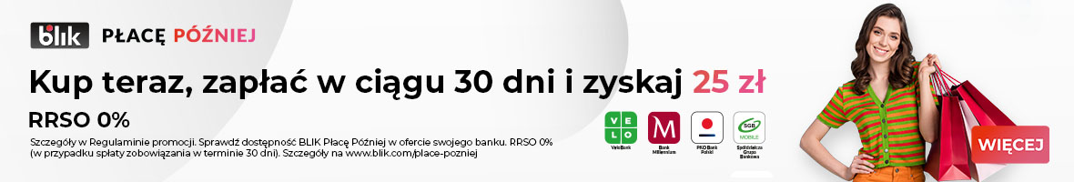 - Korzystając z promocji „Kup teraz, zapłać mniej z BLIKIEM Płacę Później” zyskasz 25 zł.
